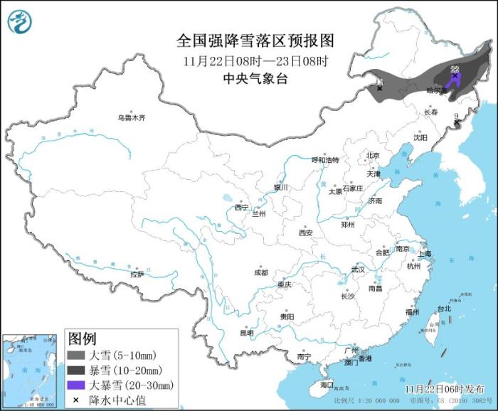 暴雪黃色預警:預計,11月22日08時至11月23日08時,內蒙古東部、黑龍江中東部、吉林北部和長白山區(qū)等地的部分地區(qū)有大到暴雪,其中,黑龍江中部局地有大暴雪(20~22毫米);上述地區(qū)新增積雪深度6~12厘米,局地可達16厘米以上。