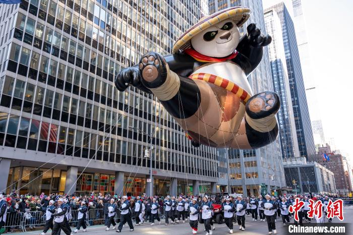 當?shù)貢r間11月23日,第97屆梅西百貨感恩節(jié)大游行在美國紐約曼哈頓舉行。圖為基于動畫電影《功夫熊貓》里阿寶的造型設計的巨型氣球行進在曼哈頓街頭?!≈行律缬浾?王帆 攝