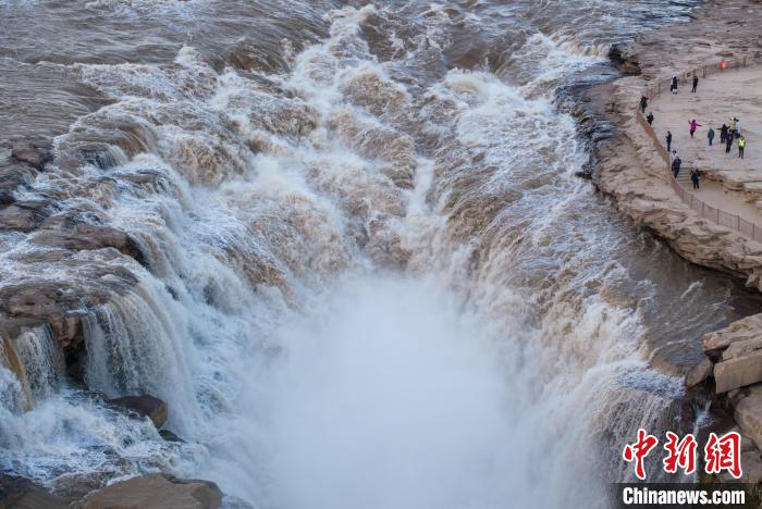 初冬時(shí)節(jié),壺口瀑布水色褪黃轉(zhuǎn)清,從“濁浪翻滾”變?yōu)椤鞍桌颂咸臁薄L咸宵S河水湍流噴瀉,直落龍槽,激起層層浪花,白霧躍然升騰。其聲、其勢(shì)、其景,壯、秀、奇,使人陶醉其間。