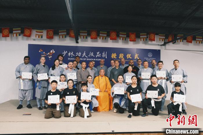 當?shù)貢r間12月1日,澳大利亞少林寺禪武堂在悉尼舉行大洋洲少林功夫段品制授段儀式,少林寺方丈釋永臨現(xiàn)場為當?shù)厣倭止Ψ驉酆谜呤谟瓒挝弧?張浩鑫 攝)