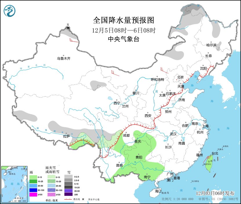 12月5日08時(shí)至6日08時(shí),新疆北疆北部、內(nèi)蒙古中東部、黑龍江西北部、西藏東部和北部、甘肅河西、川西高原等地部分地區(qū)有小雪或雨夾雪,其中,內(nèi)蒙古東北部、黑龍江西北部、新疆北疆北部等地部分地區(qū)有中到大雪(5~8毫米)。西南地區(qū)東部、云南東部、廣西大部、臺(tái)灣島等地部分地區(qū)有小雨。新疆北部、內(nèi)蒙古中西部等地部分地區(qū)有4~6級(jí)風(fēng)。