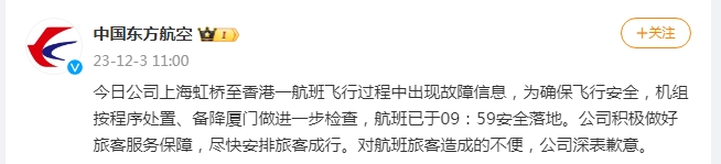 中新網(wǎng)12月3日電 據(jù)中國(guó)東方航空官方微博消息,3日該司上海虹橋至香港一航班飛行過程中出現(xiàn)故障信息,為確保飛行安全,機(jī)組按程序處置、備降廈門做進(jìn)一步檢查,航班已于09:59安全落地。