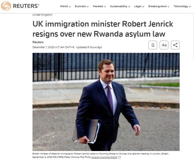 報道稱,詹里克對英國政府當日公布的“盧旺達安全(庇護和移民)法案草案”持有不同意見。他在一封辭職信中表示,該立法是在2024年英國大選之前解決移民危機的“最后機會之一”。