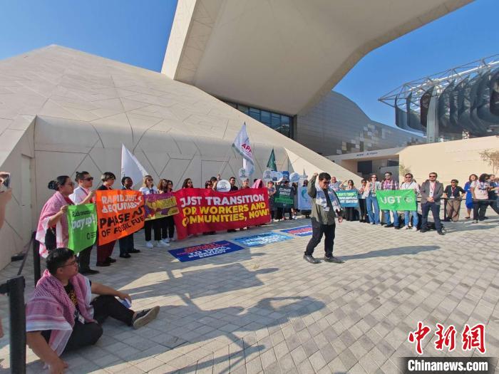 12月9日,阿聯酋迪拜,抗議者在聯合國氣候變化迪拜大會藍區(qū)會場集會并呼吁公正轉型。 中新社記者 龐無忌 攝