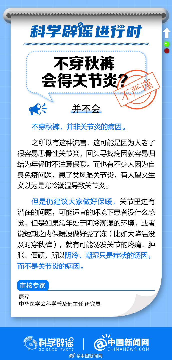 中新網(wǎng)12月11日電 不穿秋褲,并非關(guān)節(jié)炎的病因。之所以有這種流言,這可能是因為人老了很容易患骨性關(guān)節(jié)炎,回頭尋找病因就容易歸結(jié)為年輕時不注意保暖。而也有不少人因為自身免疫問題,患了類風濕關(guān)節(jié)炎,有人望文生義以為是寒冷潮濕導致關(guān)節(jié)炎。但陰冷、潮濕是疼痛、僵硬等關(guān)節(jié)炎癥狀的誘因(而不是病因),仍建議大家做好保暖。(來源:@科學辟謠 @中國新聞網(wǎng))