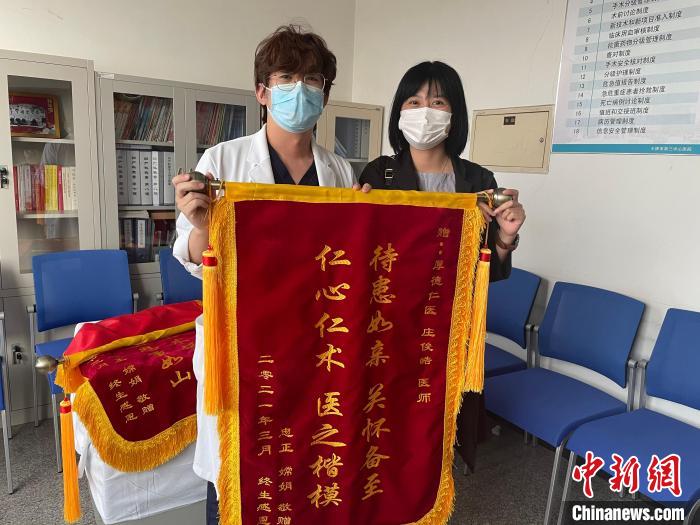 患者出院一個(gè)禮拜以后,專程帶著錦旗來致謝莊竣皓。受訪者供圖