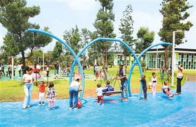 埃塞俄比亞首都亞的斯亞貝巴河岸綠色發(fā)展項(xiàng)目是由中國(guó)援助的工程,包括整治城市河道、在河道周邊修建公園和其他公共設(shè)施等。圖為當(dāng)?shù)睾⒆觽冊(cè)趤喌乃箒嗀惏秃影毒G色發(fā)展項(xiàng)目的兒童樂(lè)園玩耍。