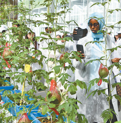 11月14日,參加中非農(nóng)業(yè)合作論壇的嘉賓在海南三亞市吉陽(yáng)區(qū)大茅村的農(nóng)業(yè)科創(chuàng)中心參觀。