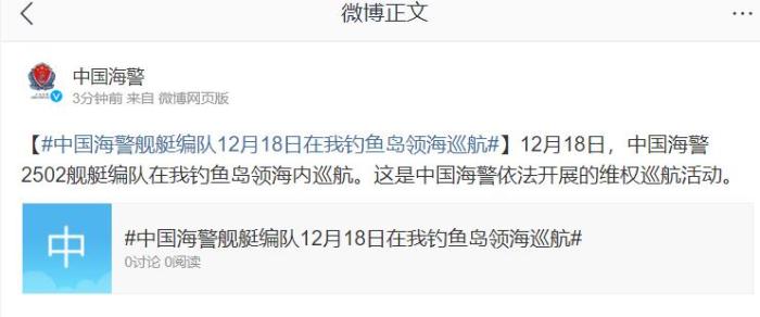 中新網(wǎng)12月18日電 據(jù)中國海警官方微博消息,12月18日,中國海警2502艦艇編隊在我釣魚島領海內(nèi)巡航。這是中國海警依法開展的維權(quán)巡航活動。