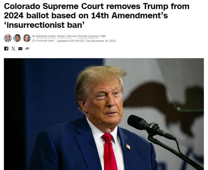 中新網(wǎng)12月20日電 綜合美媒報道,美國科羅拉多州最高法院當?shù)貢r間19日裁定,根據(jù)美國憲法第14修正案,鑒于美國國會騷亂事件,將共和黨籍前總統(tǒng)特朗普從該州2024年總統(tǒng)初選的投票中除名,認為他沒有資格競選美國總統(tǒng)。