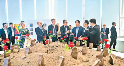 外國駐華使節(jié)和外交官在深圳南山能源生態(tài)園內(nèi)的科普教育基地參觀藝術作品《巖石里的花》。