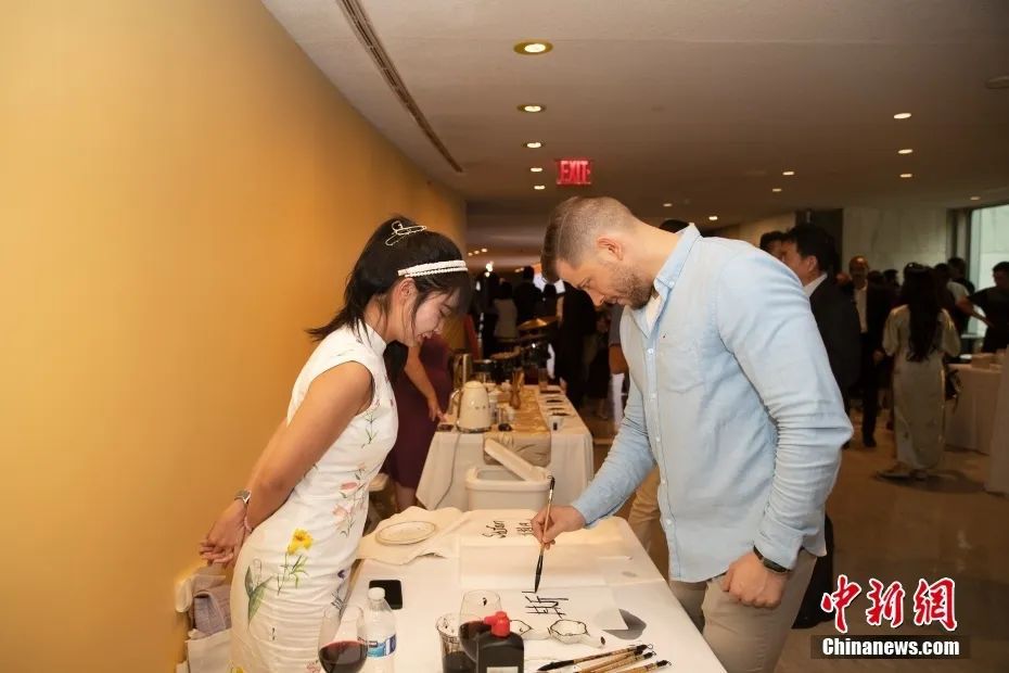 資料圖:當(dāng)?shù)貢r間6月29日晚,“何以文明”特展發(fā)布儀式在紐約聯(lián)合國總部舉行,與會嘉賓體驗中國書法。中新社記者 廖攀 攝