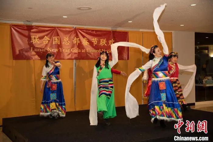 資料圖:當(dāng)?shù)貢r間1月20日,聯(lián)合國中國書會舞蹈團(tuán)在紐約聯(lián)合國總部舉辦的春節(jié)聯(lián)歡晚會上表演《格桑拉》。中新社記者 廖攀 攝