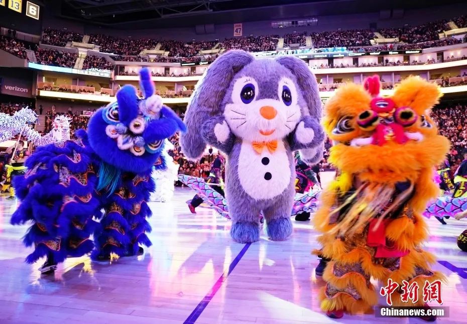 資料圖:當(dāng)?shù)貢r間1月22日,中國農(nóng)歷新年正月初一晚,美職籃(NBA)金州勇士隊在主場迎戰(zhàn)布魯克林籃網(wǎng)隊的比賽中,按照多年的傳統(tǒng)慶祝中國農(nóng)歷新年的到來。圖為兔子人偶出現(xiàn)在舞龍舞獅表演中。中新社記者 劉關(guān)關(guān) 攝