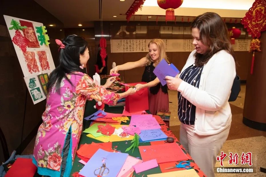 資料圖:來賓在招待會現(xiàn)場體驗中國傳統(tǒng)年俗文化剪紙。中新社記者 廖攀 攝