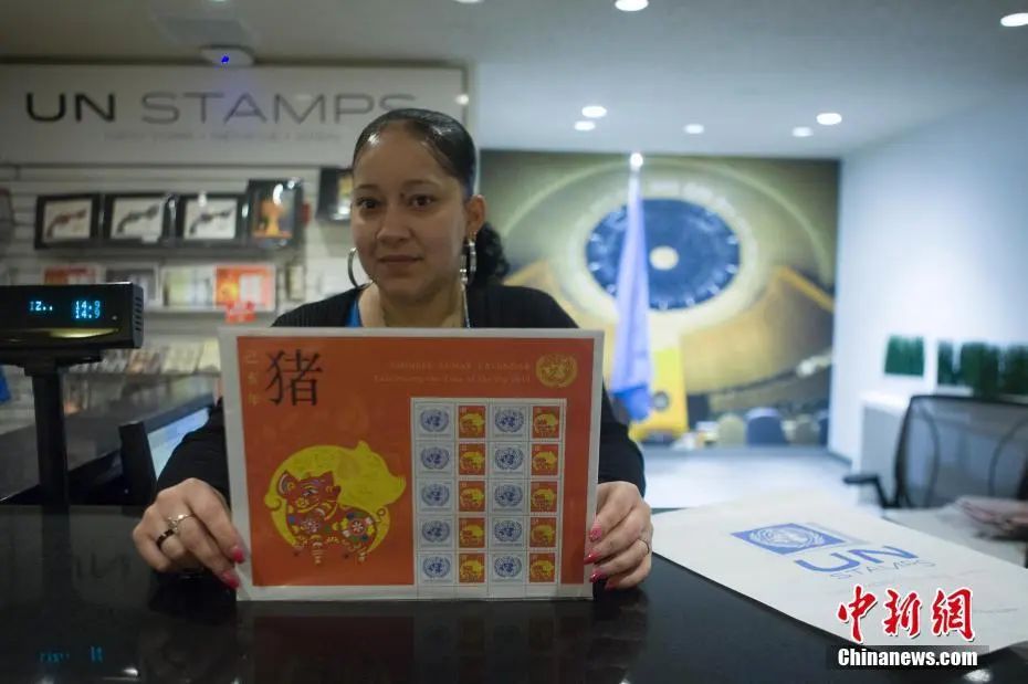 資料圖:2019年1月11日,為慶祝即將到來的中國農(nóng)歷己亥豬年,聯(lián)合國郵政管理處正式發(fā)行“中國農(nóng)歷生肖”系列己亥豬年特別版郵票。圖為紐約聯(lián)合國總部郵管處銷售點的工作人員展示己亥豬年特別版郵票。中新社記者 馬德林 攝