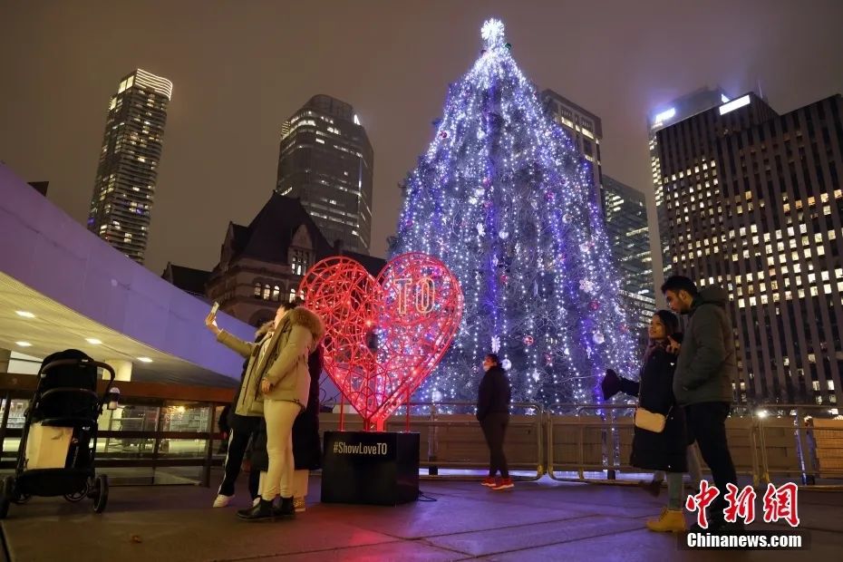 資料圖:當(dāng)?shù)貢r間2021年12月24日,圣誕平安夜,加拿大多倫多市政廳廣場的圣誕樹與愛心造型的彩燈吸引民眾駐足留影。中新社記者 余瑞冬 攝