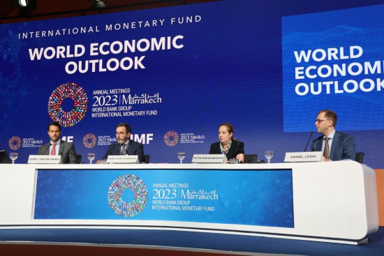 這是2023年10月10日在摩洛哥馬拉喀什拍攝的《世界經(jīng)濟(jì)展望報(bào)告》發(fā)布會(huì)現(xiàn)場。新華社記者霍晶攝