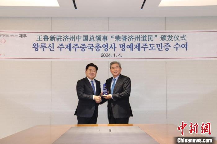 中新社韓國濟州1月4日電 韓國濟州道知事吳憐勛4日向中國駐濟州總領事王魯新頒授“榮譽濟州道民”證書。