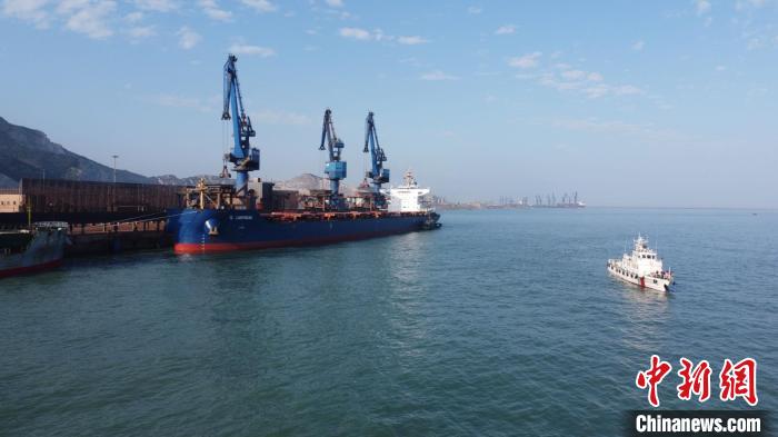 松下港牛頭灣作業(yè)區(qū)新增開放泊位首艘外輪(右2船)靠泊。福州海事局供圖
