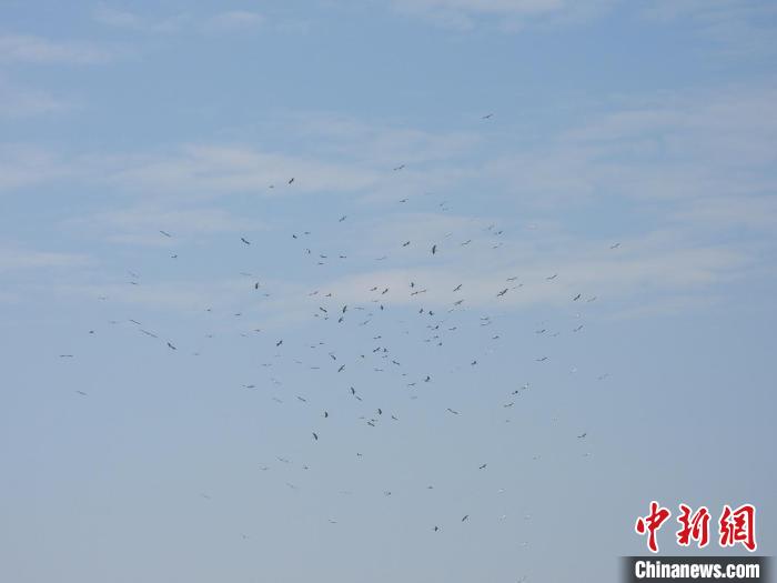成群的東方白鸛在空中飛翔。廣東省林業(yè)局 供圖