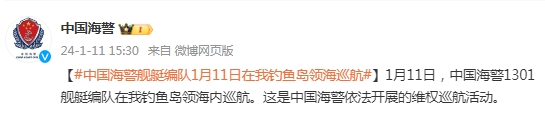 中新網(wǎng)1月11日電 據(jù)中國(guó)海警局官方微博消息,1月11日,中國(guó)海警1301艦艇編隊(duì)在我釣魚島領(lǐng)海內(nèi)巡航。這是中國(guó)海警依法開(kāi)展的維權(quán)巡航活動(dòng)。