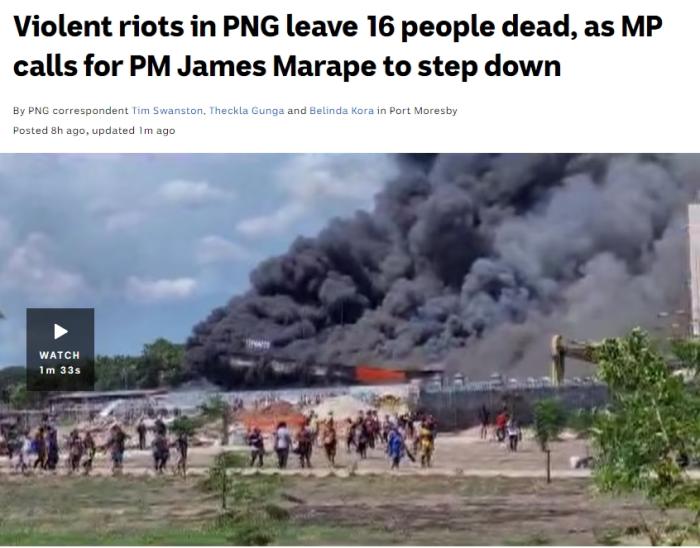 據(jù)澳大利亞廣播公司(ABC)報道,當(dāng)天,巴新部分民眾利用警察罷工的機(jī)會縱火焚燒商店和企業(yè)設(shè)施,目前騷亂已造成16人遇難,其中首都莫爾斯比港有9人死亡,第二大城市萊城則有7人死亡。