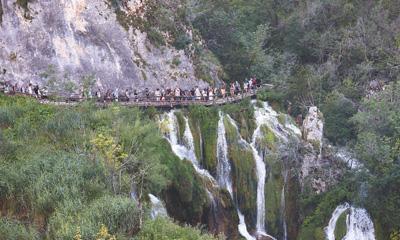 克羅地亞普利特維采湖國(guó)家公園是中國(guó)九寨溝國(guó)家級(jí)自然保護(hù)區(qū)的“姐妹”自然遺產(chǎn)地。兩者同屬喀斯特地貌,是世界非常罕見(jiàn)的冷水鈣華景觀。中國(guó)科學(xué)院成都生物研究所與克羅地亞薩格勒布大學(xué)合作成立“中國(guó)—克羅地亞生物多樣性和生態(tài)系統(tǒng)服務(wù)‘一帶一路’聯(lián)合實(shí)驗(yàn)室”,為兩國(guó)世界自然遺產(chǎn)地生態(tài)保育作出重要貢獻(xiàn)。圖為當(dāng)?shù)赜慰驮谄绽鼐S采湖國(guó)家公園參觀。