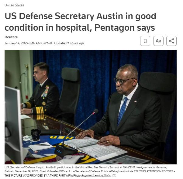 中新網(wǎng)1月14日電 據(jù)路透社報道,當(dāng)?shù)貢r間13日,美國五角大樓表示,美國國防部長奧斯汀仍在醫(yī)院接受治療,目前“身體狀況良好”。