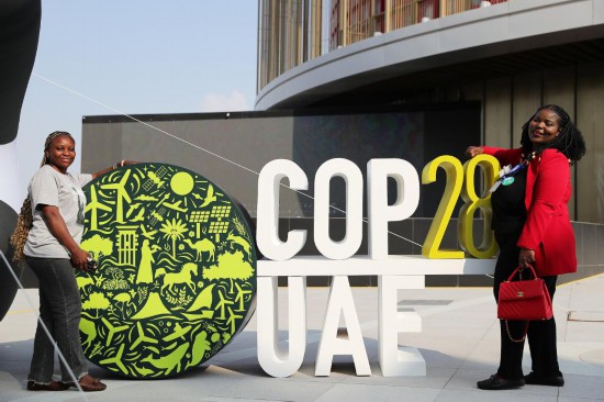 2023年12月3日,人們在聯(lián)合國氣候變化迪拜大會“綠區(qū)”的大會標識旁合影。新華社記者王東震攝