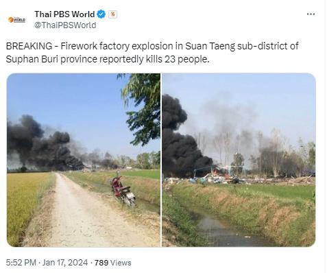 另據(jù)泰國公共廣播服務(wù)公司下屬新聞網(wǎng)站“Thai PBS World”社交媒體賬號消息,當?shù)貢r間17日,泰國中部素攀武里府一家煙花廠爆炸,目前已造成23人死亡,多人受傷。