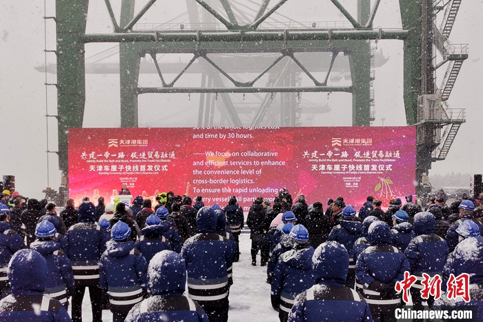 1月17日,天津車?yán)遄涌炀€首發(fā)儀式在天津港太平洋國際集裝箱碼頭舉行?!败?yán)遄涌炀€”始發(fā)于智利圣安東尼奧港,直抵天津港。未來一周,還將有2艘次智利車?yán)遄迂洿诌_(dá)天津港,累計8300噸車?yán)遄蛹捌渌厦乐蕻a(chǎn)品從天津港上岸。 中新社記者 佟郁 攝