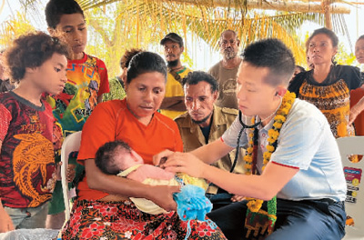 在巴布亞新幾內(nèi)亞中央省村莊里,第十二批援巴新中國醫(yī)療隊副隊長、新生兒科副主任醫(yī)師劉振球為當(dāng)?shù)貗雰郝犜\檢查。