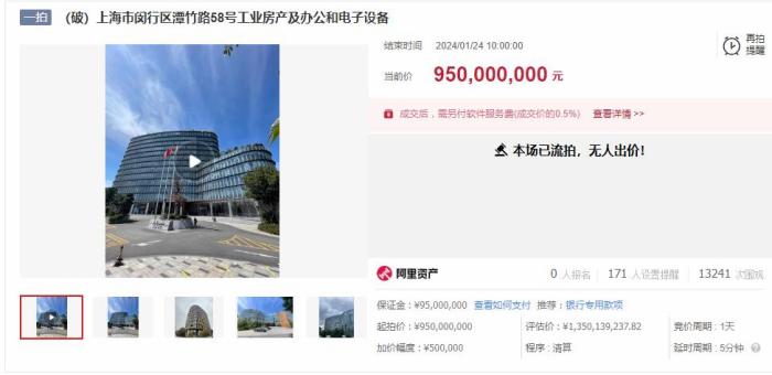 本次拍賣標(biāo)的評(píng)估總價(jià)約為13.5億元,以9.5億元的價(jià)格起拍,約為評(píng)估總價(jià)的7折。拍賣于1月23日上午10時(shí)至1月24日上午10時(shí)止,雖然這場(chǎng)拍賣有超過(guò)1.3萬(wàn)人圍觀,但最終無(wú)人出價(jià),以流拍結(jié)束。