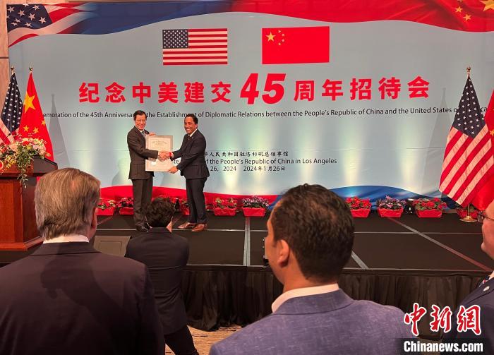 中新社洛杉磯1月27日電 (記者 張朔)約400位中美各界人士26日在美國洛杉磯歡聚一堂,共同紀念中美建交45周年。