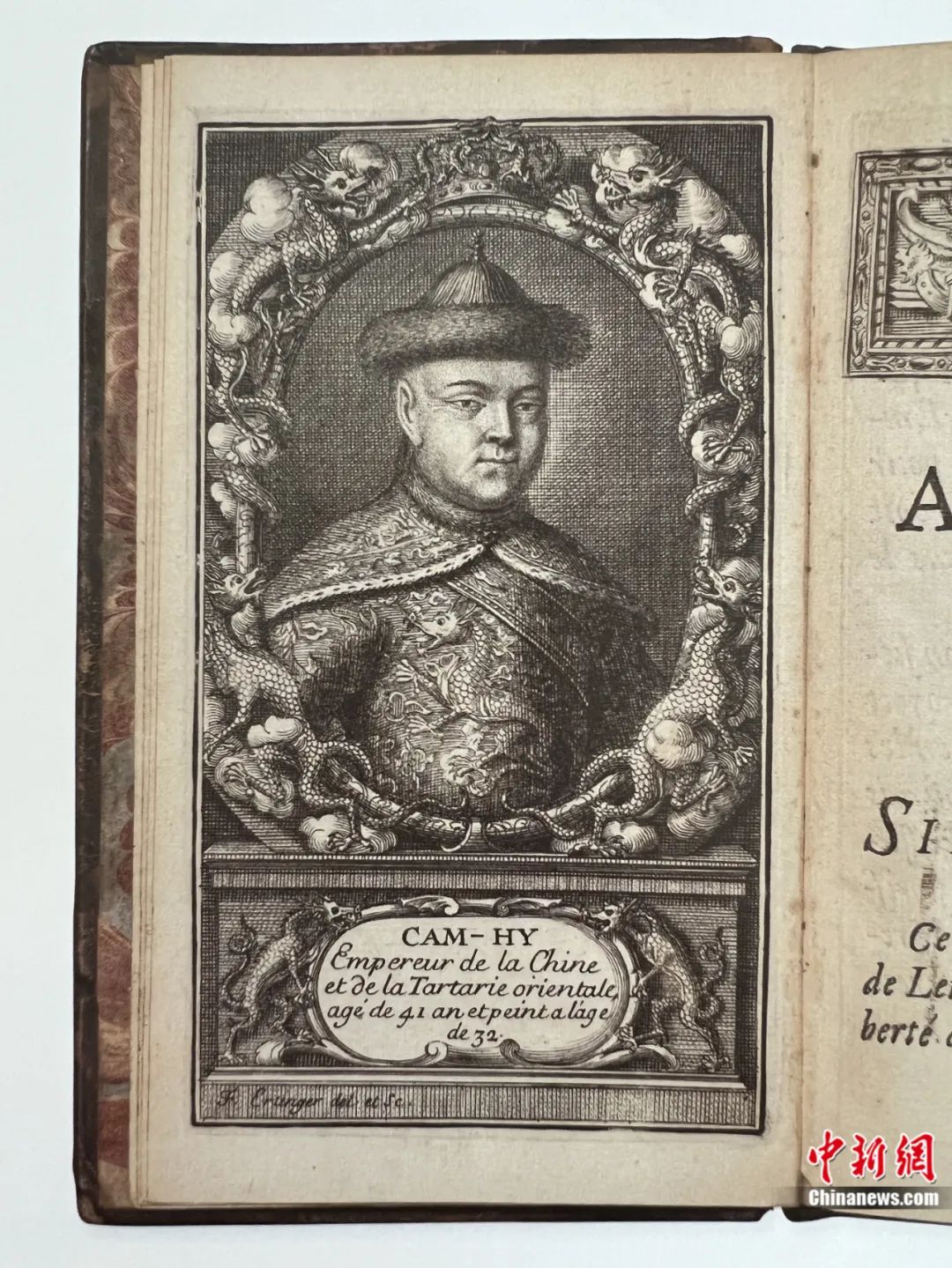 法國傳教士李明(1655-1728),受法國國王路易十四派遣來華傳教,在中國停留數(shù)年后返回歐洲。他在巴黎出版的《中國近事報(bào)道》扉頁有一幅康熙皇帝的銅版畫像,可能是歐洲最早公開出版的康熙皇帝畫像。畫像中康熙皇帝衣服的胸部繪著一條行龍,同時(shí)畫像四周邊飾以及下面的圖題兩側(cè)均裝飾中國龍的形象。龍的圖案顯然是用來表明畫像中人物的皇帝身份。