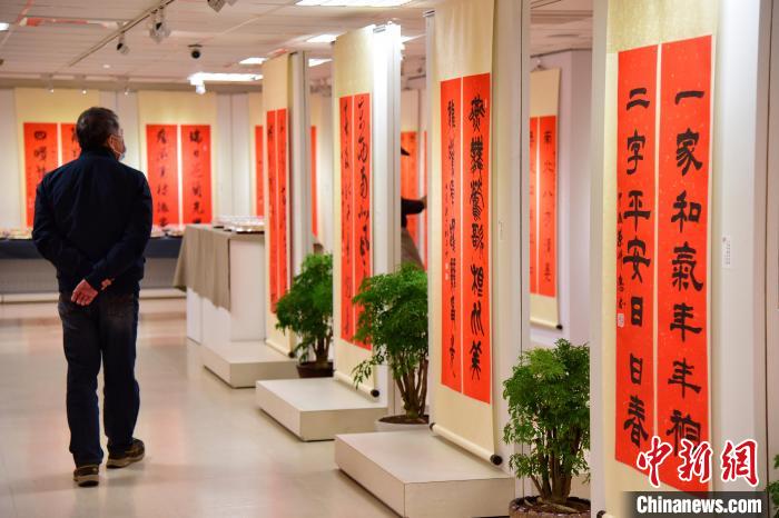 1月28日,兩岸藝術(shù)家春聯(lián)展在臺(tái)北江山如此多嬌藝術(shù)館舉行,32位臺(tái)灣藝術(shù)家、13位大陸藝術(shù)家的90多幅作品參展。圖為現(xiàn)場(chǎng)展出的春聯(lián)作品。中新網(wǎng)記者 路梅 攝