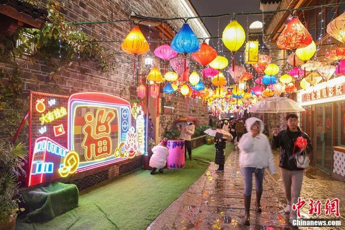 江西南昌萬壽宮歷史文化街區(qū),市民從掛滿花燈的小巷內走過。劉力鑫 攝
