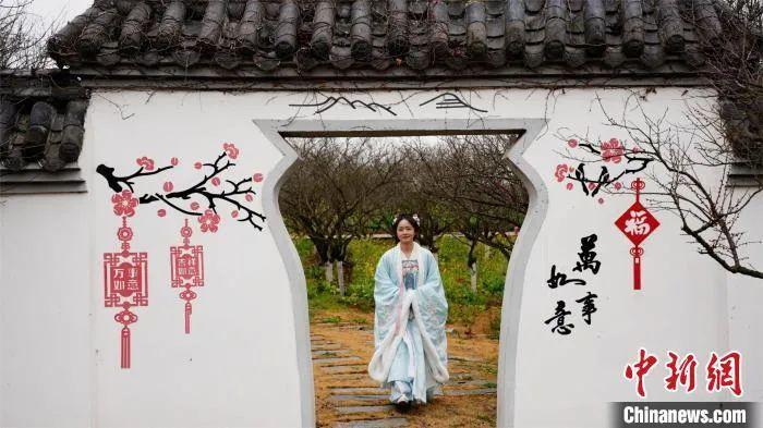 圖為江西南昌縣鳳凰溝梅園內身著漢服的游客正在游園。巫發(fā)陽 攝