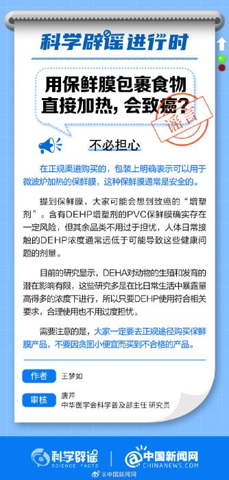 中新網(wǎng)1月31日電 在正規(guī)渠道購買的,包裝上明確表示可以用于微波爐加熱的保鮮膜,通常是安全的。提到保鮮膜,大家可能會(huì)想到致癌的“增塑劑”。含有DEHP增塑劑的PVC保鮮膜確實(shí)存在一定風(fēng)險(xiǎn),但其余品類不用過于擔(dān)憂。(來源:@科學(xué)辟謠 中國新聞網(wǎng)微博)