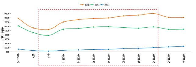 預(yù)計(jì)春節(jié)期間全國(guó)高速公路客車日均流量約4890萬(wàn)輛,小客車占客車比例預(yù)計(jì)達(dá)99%以上。貨車流量在春節(jié)節(jié)前逐日下降,在正月初一達(dá)到最低值,春節(jié)假期之后逐漸恢復(fù)到日常水平,但貨車流量同比去年預(yù)計(jì)有所增長(zhǎng)。
