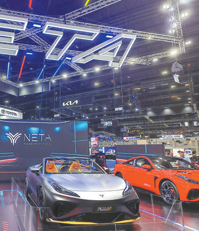 在2023年舉辦的第四十屆泰國國際汽車博覽會上,中國品牌新能源汽車廣受關注。圖為哪吒汽車展區(qū)。