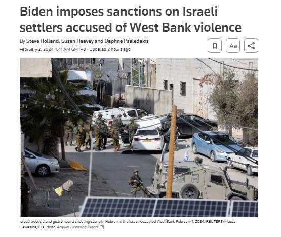 據(jù)路透社報道,拜登1日簽署了一項(xiàng)行政命令,宣布全國進(jìn)入緊急狀態(tài),允許其采取新措施打擊定居者的暴力行為,同時宣布對在約旦河西岸實(shí)施暴力行為的四名以色列極端分子實(shí)施制裁。
