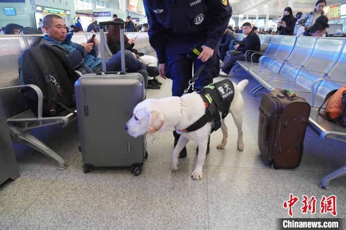 “春運的車站,密集的人群在同一個地方,到處都是嘈雜的說話聲和廣播聲,警犬的聽覺比較靈敏,它要學習的第一項技能就是克服這些外界聲音的干擾?!庇枌T何少婧說道。