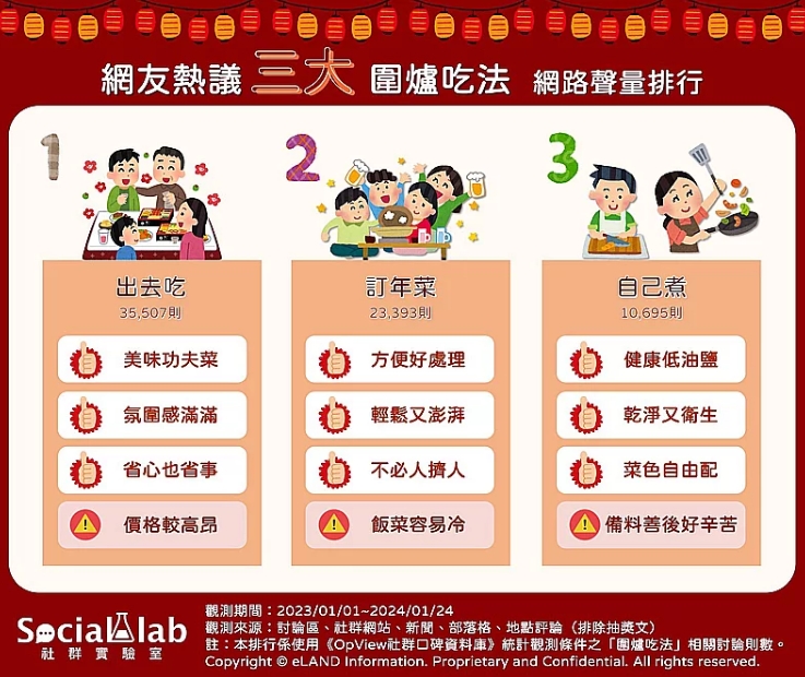 農(nóng)歷新年即將到來(lái),而重頭戲之一便是除夕時(shí)端上桌的年夜飯!觀察近一年臺(tái)灣網(wǎng)友針對(duì)“圍爐吃法”相關(guān)話題的討論,可以發(fā)現(xiàn)近年不少人為了避免自行下廚的繁復(fù)工程,紛紛選擇在除夕時(shí)出去吃年夜飯,只需一通電話預(yù)約,即可輕松享用美味的菜肴,省心又省事。