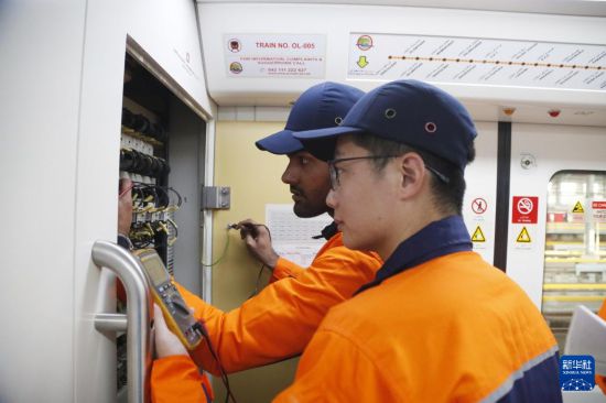 2月1日,巴基斯坦拉合爾軌道交通橙線項(xiàng)目中巴方員工在檢修列車。新華社發(fā)(艾哈邁德·卡邁勒攝)