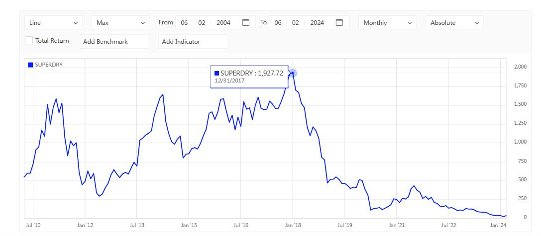值得一提的是,倫敦證券交易所網(wǎng)站顯示,Superdry的股價曾在2017年年底達到過1927.72便士/股。