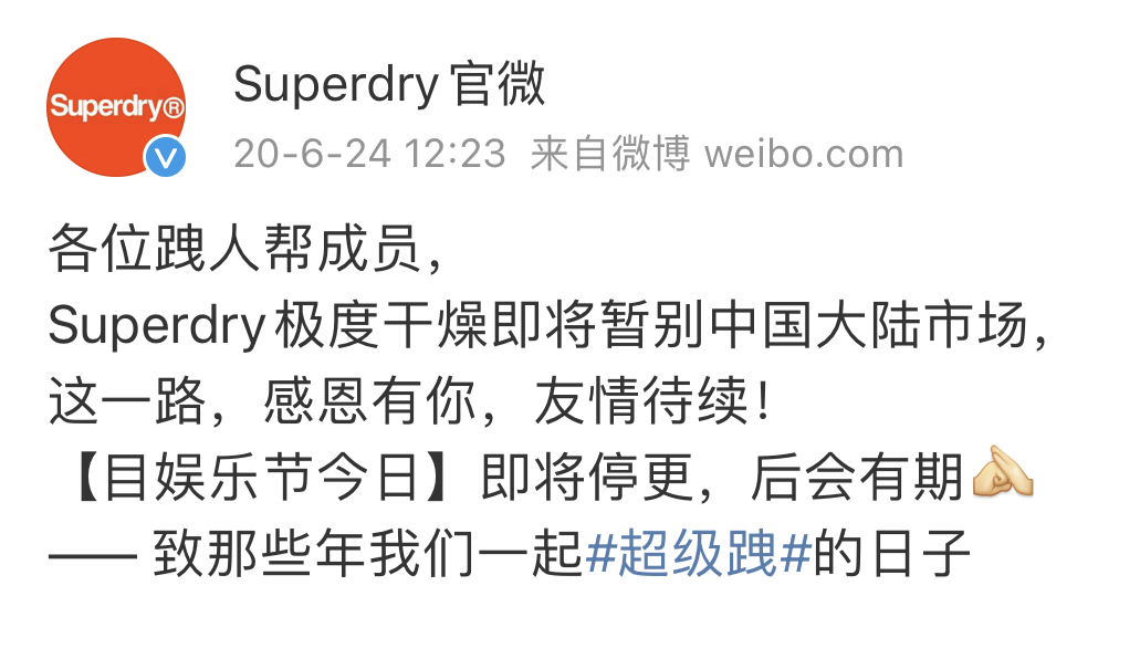 2020年6月,Superdry宣布,將暫別中國大陸市場,并稱“致那些年我們一起超級跩的日子”。