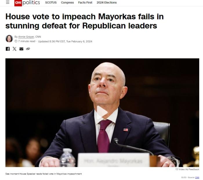 中新網(wǎng)2月7日電 綜合美媒報道,當?shù)貢r間6日,美國國會眾議院以214票對216票的表決結果,未能通過對美國國土安全部長馬約卡斯的彈劾案。