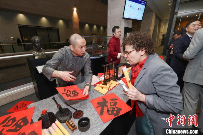 當?shù)貢r間2月6日晚,加拿大蒙特利爾,中國駐蒙特利爾總領(lǐng)館與中國常駐國際民航組織理事會代表處在國際民航組織(ICAO)總部聯(lián)合舉辦“共慶春節(jié)”主題活動。圖為當?shù)厝A人書法家(左)向與會嘉賓講解以中國書法書寫的“福”字?!≈行律缬浾? 余瑞冬 攝